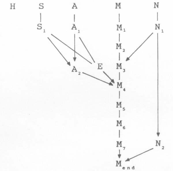 In the year 1702 Newton's four-page `Theory of the Moon's Motion' (TMM) was published, in a mathematical-astronomical textbook published by David Gregory, who gave it its title (16). My researches did not confirm that Newton had composed this opus in the 169os and merely held it back until then, as some have suggested. Yet, considering that Newton was in 1702 fully occupied as the new Master of the Mint in London, this was a surprising moment to produce a lunar theory as the fruit of earlier labours. TMM featured six new `equations', such that the Moon became equated seven times. Its procedure is given as a flow diagram in Fig. I, where the symbols used are S for Sun, M: Moon, A: apse, N: node and H: aphelion. The method developed by Newton was essentially Horroxian, though somewhat refined (17). The new lunar equations are the second, third, sixth and seventh, with the annual equation as the first and the variation as the fifth. Also the node and apse line were given `annual equations', making them vary seasonally. A Horroxian equation of centre forms the central fourth `equation' of TMM, using the varying eccentricity E and the twice equated apse A2. The Newtonian `theory' of 1702 contained nothing resembling calculus, nor had it any inherent connection with gravity theory, which was unmentioned in the text. One may query whether it contained trigonometric time-dependent functions: the instructions were all in words, thus it would specify that what was in fact a sine function should be positive up to I8o° and then be made negative after that - readers could evidently not take for granted that a sine function would turn negative above that value. 3 A MODERN RECONSTRUCTION