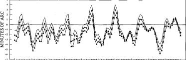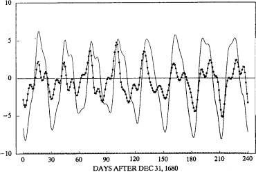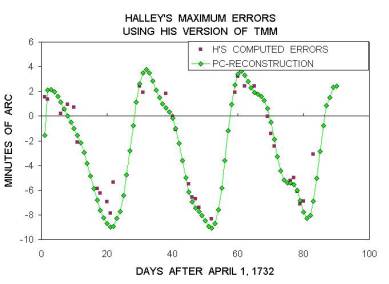 Halley made over 2000 meridian-transit lunar positional measurements, published posthumously, together with their GMT times. The `raw' data whose non-publication has been much remarked upon presumably comprised the lunar limb positions, i.e. unadjusted by lunar semidiameter, which remain in his notebook (31). From his first five years of observations (1722-7) the lunar limb positions in right ascension were published, after which he switched to longitude of lunar centre, as more straightforward for checking of the theory. He did not publish declination or latitude values, as these were not essential for his purpose. I suggest that Halley's posthumous Astronomical Tables contained all the observational data that he wished to have published. A check upon the error-values of a page of Halley's meridian-transit lunar centre longitude estimates, over June-August 1732, by comparing with values from the modern ILE program, gave a mean error of -14" ±20", a standard deviation of one-third of an arcmin. For the earlier-published limb observations given in right ascension, selecting January-April 1722, Bernard Yallop of the Nautical Almanac Office ascertained their accuracy as -10"+33". These were the first observations recorded using Greenwich Mean Time and the most accurate that anyone had then produced. For comparison, mean longitude errors in a set of Flamsteed's lunar limb meridian-transit readings Yallop found to be considerably larger, at 7"±70"" (32). An evaluation of Halley's Saros method was performed by generating a set of TMM error-patterns, sampling at noon every two days over a six-month period, then repeating this procedure starting exactly one Saros later, and a third time for one Saros earlier. Superimposing these three sets of error patterns gave the error-curves shown in Fig. 4. The marvellous synchrony of the Saros appears in their concordance. A drift appears in values over these cycles due to a slight error in Newton's mean motion value. Correcting for this gave a still closer accord, well within an arcmin. Over the period for which Halley was using TMM, i.e. the 1720s and 30s, its mean motion had accumulated an error of 1-2 arcmin as can be seen in these diagrams (33). Halley claimed that his method was good enough for the longitude prize. It appears to have been the most accurate method of ascertaining lunar longitude produced in the first half of the eighteenth century.